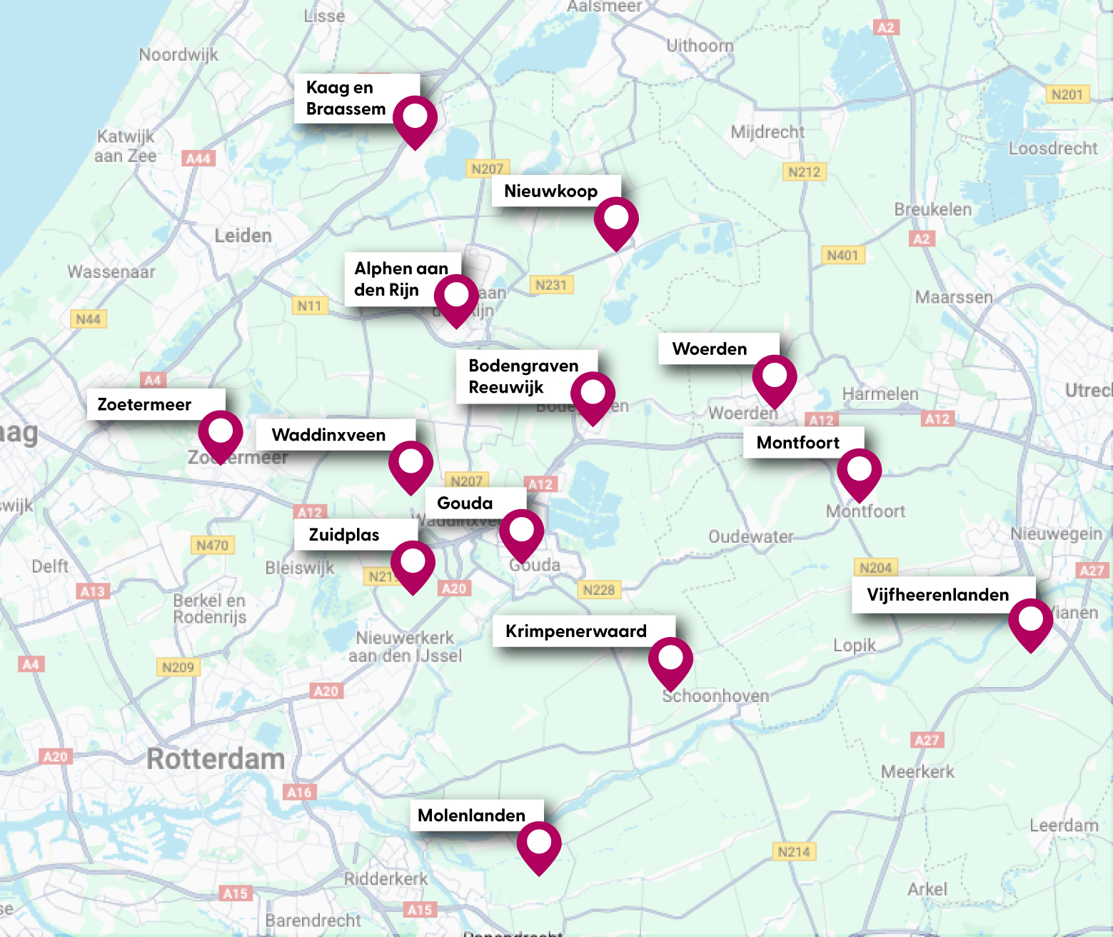 Op het kaartje hiernaast zie je aangegeven de 13 gemeenten in het Groene Hart die bij ons platform zijn aangesloten: Alphen a/d Rijn, Bodegraven-Reeuwijk, Gouda, Kaag en Braassem, Krimpenerwaard, Nieuwkoop, Molenlanden, Montfoort, Vijfheerenlanden, Waddinxveen, Woerden, Zoetermeer en Zuidplas,.